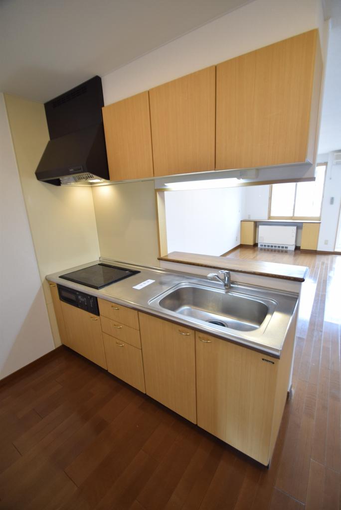 キッチンはリビングの様子が見える対面式キッチン♪お手入れの便利な電気コンロのシステムキッチンです♪